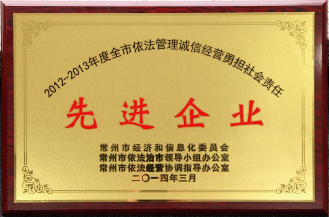 2012-2013年度全市依法管理诚信经营勇担社会责任“先进企业”奖牌