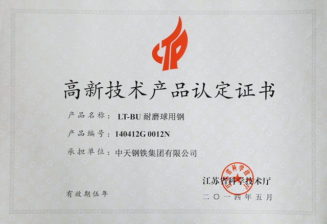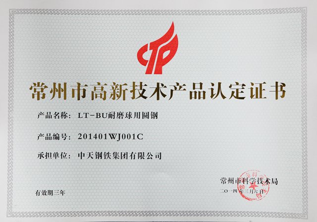 常州市高新技术产品认证证书LT-BU耐磨球用圆钢