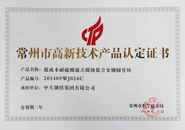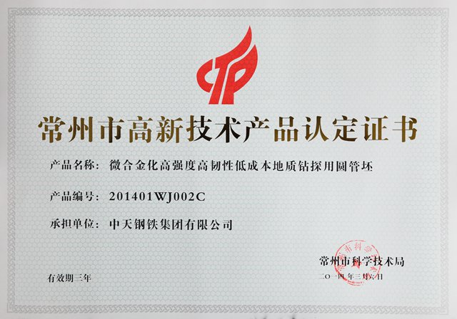 常州市高新技术产品认证证书微合金化高强度高韧性低成本地质钻探用圆管坯