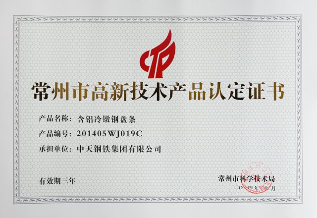 常州市高新技术产品认证证书含铝冷镦钢盘条