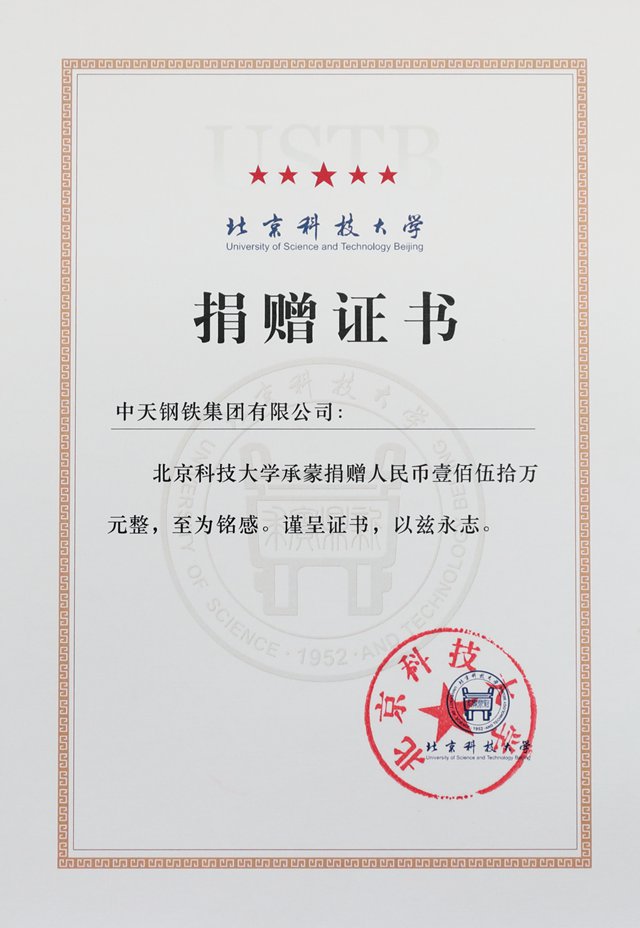 捐款北京科技大学150万证书