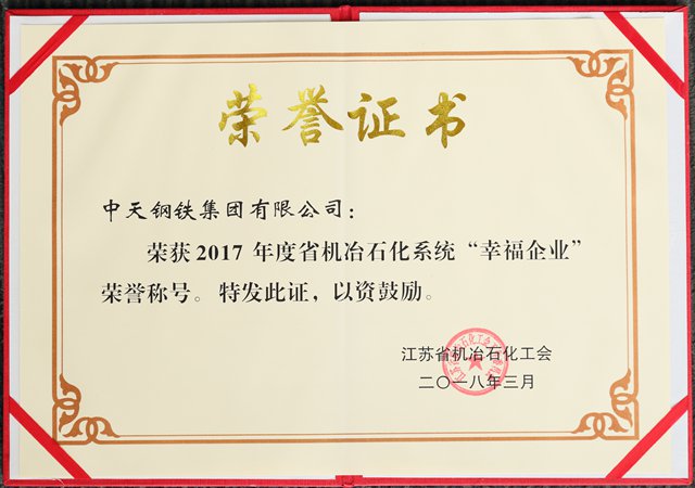 世界杯网站网页荣获2017年度省机冶石化系统“幸福企业”荣誉称号